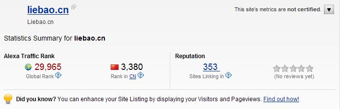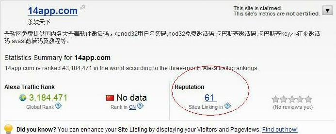 PR是什么:PR值全称为PageRank(网页级别),2001年9月被授予美国专利,专利人是Google创始人之一拉里·佩奇(Larry Page)。因此,PageRank里的page不是指网页,而是指佩奇,即这个等级方法是以佩奇来命名的。它是Google排名运算法则(排名公式)的 一部分,是Google用于用来标识网页的等级、重要性的一种方法,是Google用来衡量一个网站的好坏的重要标准之一。在揉合了诸如Title标识和 Keywords标识等所有其它因素之后,Google通过PageRank来调整结果,使那些更具“等级/重要性”的网页在搜索结果中令网站排名获得提升,从而提高搜索结果的相关性和质量。 PR是谷歌推出的一款网站等级评测系统,数值从0-10。一般谷歌是这样凭定的:PR0为起步网站(即刚成立的网站)、PR1为新手站、PR2-PR3为菜鸟站,PR4为成熟稳定的网站,PR5-PR6为很受欢迎的网站,PR7-PR9为极其非常受欢迎的网站,PR10的网站很少,谷歌将其值定为PR10。 前面讲的都是理论性的东西,根据笔者三年SEO经验,得出一些结论,根据alexa信誉值多少也可以预测PR值大小,信誉值越高,PR值最大,反之则越小。 评测地址: 以下是笔者总结出来的,仅供参考(考虑到PR值一般三个月左右更新一次,所以Reputation值随着每天外链的增长而不断变化),一般alexa Reputation值更新为一周一次。 Reputation值小于50,PR值<2