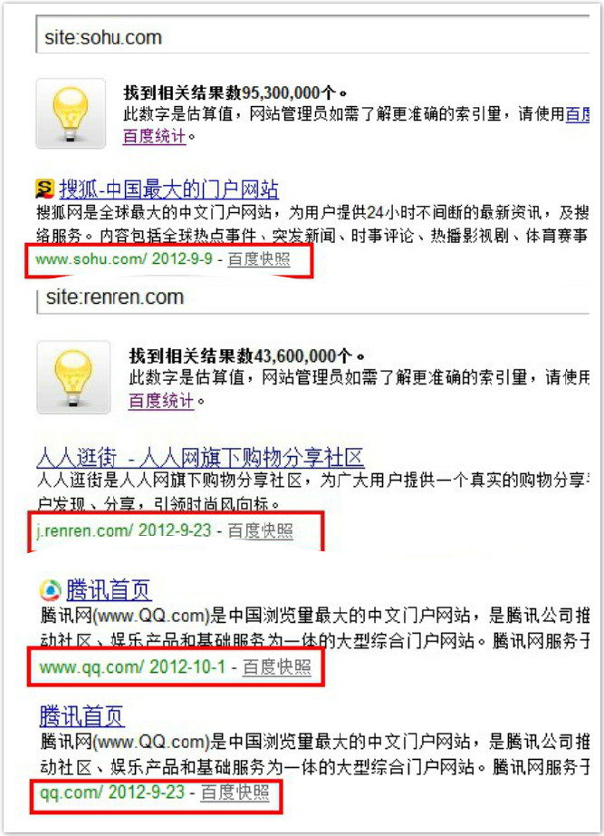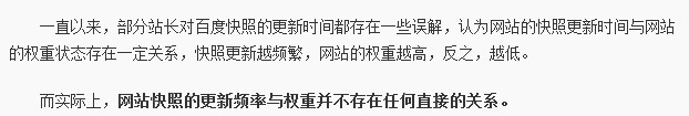 开心网从综合实力上来讲虽然还不及人人网,但是,两者的差距应该算比较小的了,关键是,开心网的快照虽然最新的,但是,相对与人人网来说,百度可能会更重视开心网吗?百度蜘蛛去开心网的频率难道真的比人人网频繁吗?我想答案是否定的。 综上所述,百度快照越快,快照越新,百度就越重视其网站,蜘蛛去他网站的次数就越频繁,这个结论是扯淡,根本无法证明百度快照有这样的意义。 二、更加荒诞的认为:百度快照影响到了权重,快照越新,快照更新的越频繁,给网站的权重也就越高。这个结论就更荒诞了,而且百度官方也声明过:网站快照的更新频率与权重并不存在任何直接的关系。