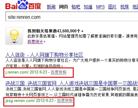 从图中很容易看出,黄页88网和中国机械网的快照是最新的,而人人网的快照是上个月的,难道这就说明百度更信任黄页88网,蜘蛛来黄页88网的频率比去人人网的频率更高?我想是人都明白,人人网绝对比黄页88网强,不可能百度更看重黄页88网和机械网的。还有人会说,黄页88网跟人人网根本不在一个档次,相差特别远,不能比,那么好,看下图:
