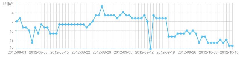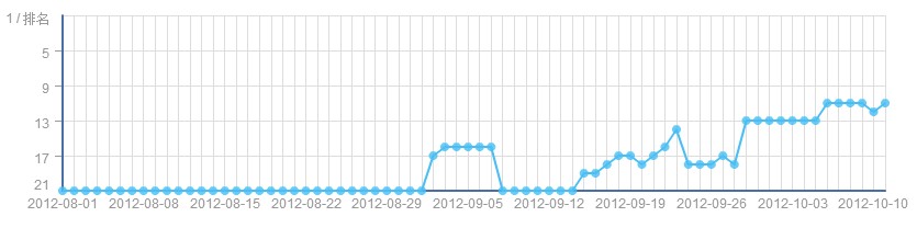 百度统计工具是广大站长朋友再熟悉不过的了,在工具当中有一项是专门监控关键排名的,在大家把注意力都集中到关键字排名的时候,其实我们是可以根据一阶段的关键字排名情况得到一组曲线(主机点评网定义其之为“关键字曲线”),根据曲线我们可以更加深刻的了解到网站关键字的健康状况,可以得到更多信息用以帮助我们提升关键字排名,从而达到网站流量上升的目的。 今天主机点评网为广大站长朋友介绍几种曲线。选取关键字排名时间从8.1到10.10。 一. 稳定型曲线 如下图,这类关键字排名较为稳定,这类关键字多属于自然类关键字,也就是该关键字与自身网站名字相关度极高,所以从开始就有很高的排名,配合一些常规的优化工作,可以始终保持在一个很高的位置上,这类关键字健康度较高,同时,也是我们网站流量的保证之一。