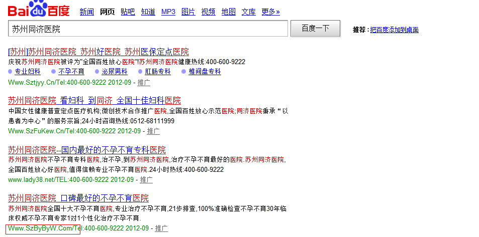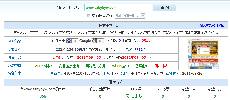这个是我随便找的一个医院被K的站,请看下面做了推广后效果 原因一、信誉问题:做什么事都要讲究一个信誉,医疗业不例外,毕竟医疗是块大肥肉,只要稍微有点资质的医院都像去啃一口,所以就出现了一些“挂羊头卖狗肉”的投机倒把的人,明明没那个实力却在网上乱吹,导致用户消费时遭到欺骗,其中这块百度自身就有问题已,南京SEO看到一个医院站被“拔毛”了,可是做了推广照样第一,这和搜索原则完全相反,是不是谁有钱谁就在第一?不管是有无资质的都可以上首页,被“拔毛”的站肯定是有原因的。