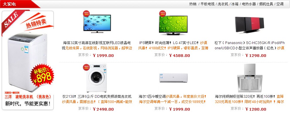 “大家电”用的是H2标签,至于为什么没有加链接,我个人的理解是这样的 1:此页主要针对的关键字是“家用电器”这个大范围的词,毕竟这是一个分类首页,过多的锚文本可能会导致权重分散 2:导航里已经出现两个“大家电”的锚文本链接勾引蜘蛛去爬,这里就没必要再给蜘蛛增加负担了,同一个链接同样的锚文本蜘蛛爬多了或许也会感到厌烦和累的 3:对于用户来说,导航里的“大家电”是告诉用户,点击这里可以进入“大家电”这个分类,而这里的“大家电”其目的仅仅是告诉用户,下方的产品是属于大家电这个类别里的,是想让用户看下方所展示的产品,而不是让用户点击这里进入“大家电”分类。所以这里只用了红底加粗的文字来告诉用户信息。 右边几个锚文本链接,首先第一个锚文本就是“热销”,顾名思义就是卖得很好的产品,人们购物的时候都有一个通用的心理的,大家都在买的东西就算不是什么好东西但也绝对不会差,这个心理在网购方面体现得特别特别强烈,人们进入一个产品列表页,最常用的排序方式就是“按销量排序”和“按价格排序”,所以“热销”二字在一定程度上勾起了用户想去了解它的兴趣,只要用户感兴趣了,也就成功了第一步了…… 后面几个小分类链接,其目的有两个 1:给蜘蛛一个小网,让它去爬 2:告诉用户“大家电”这个分类里包含了这几个类别的产品 但是由于空间有限,不可能全部展示出来,所以只展示了几个最常用的类目。 一张大图,清晰的把产品图片呈现出来。 左上角一个“sale”,直接告诉用户,这个产品很廉价。 三条由细变粗的斜杠很含蓄的表达了此商品或许随时都会涨价,现在不买,过了这个村就没有这个店了,给用户一种紧凑感。 斜杠里几个红色加粗的文字简单明了直观的告诉了用户这个产品现在到底是个什么活动,大家都知道“活动”理论上来说都是很便宜的并且周期很短的,迟了就没了,进一步提醒用户这个产品很便宜,快买吧,迟了这个价格就买不到了。 红色由深入浅的渐变背景色爆炸星形加上黄色加粗的字体标注商品价格,赤裸裸的告诉用户,这个价格很劲爆;其图形大小加上其设计师高明的搭配方式,使用户只要浏览到了这一块来,用户的眼球中绝对不会忽略这个爆炸星形的价格。只要有大量的用户看到并关注了它,那么订单自然而然的就来了。 右边六个产品,以标准的图片+标题+旁白+价格形式整齐的排列出来,每张图片都加了ALT,告诉蜘蛛这个图片是什么东西,清晰的产品图片使用户一眼就看出来这是个什么东西,标题简要介绍其品牌以及基本属性,橘色的旁白小小的刺激一下用户的购买欲,红色加粗的“京东价”提醒用户或许这个价格你只能在京东才能享受得到,其他地方这个价格可能是买不到的,暗示用户可以去别处比一下价格再来购买;给用户一种安全感。 几个分类产品展示版块中间穿插的压榨商家的广告咱就不多说了,只有利润多元化才能赚更多的钱……