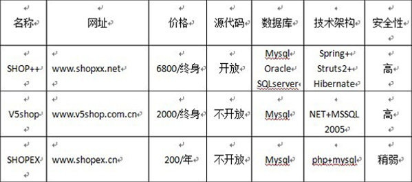 我们是一家酒类销售公司,近几年,受网购销售模式的冲击,公司决定借火爆发展的互联网展开网上销售,希望销售业绩出现新的增涨亮点。因为我大学期间专业是电子商务,便扛起了公司网上销售渠道的重任。 开展网上销售说起来比较容易,选择网店系统、购买空间、域名、商品上传...但真正做起来就不是想像中的那么容易,网店系统 的选择成为关键环节,因为要考虑到网店的安全、性能,还有网店的后续拓展方面等。通过了解,市面上大小小的网店系统有20几家,且自个都有优势和特点,网店系统的选择就成为接下来头疼的事。 既然扛起了公司网上开店的重任,我也没有丝毫马虎,接下来就是选择网店程序了。网店程序的选择无非是在建站技术JAVA、ASP.NET、PHP语言中选择,ASP语言已经被微软公司淘汰便直接省略。通过几天的搜索、调查、咨询、朋友反馈,网店程序的选择范围缩小到,JAVA语言中的SHOP++、.NET语言中的V5SHOP、PHP语言中的SHOEPX,当然各建站技术中还有其它优秀的网店程序,只是要综合考虑自己的需求,网店的安全、性能,网店后续拓展等方面,当然也综合比较的价格,所以没有对其它网店程序作详细的分析。 SHOP++、V5shop、sohpex基本介绍 SHOP++长沙鼎诚旗下产品,国内首款基于JAVA技术开发,开放源代码的网店程序。也许有网友对SHOP++系统感到陌生,因为SHOP++官方在2009年才对外开放SHOP++V1.0版本,并将源代码的提供免费下载。SHOP++V1.0版本免费开放后的两周内下载次数达到13万次,成为广大开源爱者和JAVA爱好者的研究对像,知名度不亚于Aebiz、Probiz,是国内主流的JAVA网店系统之一。 v5shop的技术前身是已经被微软淘汰的ASP,08年被上海威博收购后,系统构架技术升级为ASP.NET,是.NET网店系统中的老牌产品。 SHOPEX上海商派电子商务软件代表产品之一,是国内最早的PHP网店程序,国内用户号称有50万大军。 SHOP++、V5shop、sohpex综合分析