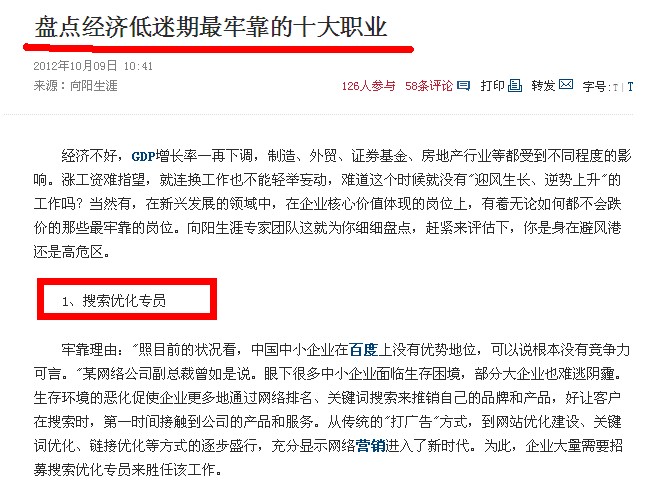 自从6.28百度大面积的K站之后,“度娘”彻底的伤透了我们SEoer们幼小的心灵,从而也导致了很多SEO工作者有了想换行的想法。甚至有朋友说,如果再继续做下去的话,迟早会被百度折磨得半死。之前也有看过朱卫坤老师写的《seoer想长寿,远离百度》的文章,这篇文章确实道出了SEO从事者们的心酸历程。但是,今天美女SEO周珍想要和大家分享一则好消息,看完之后,你还会想要远离SEO吗?好了,下面直接上图,有图有真相: