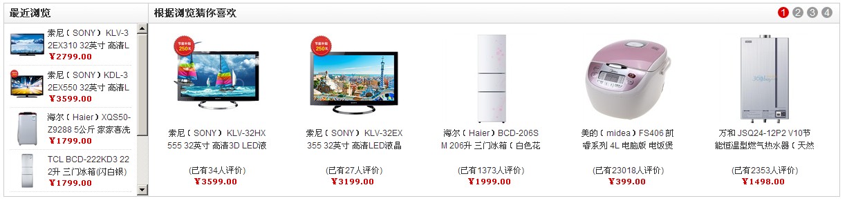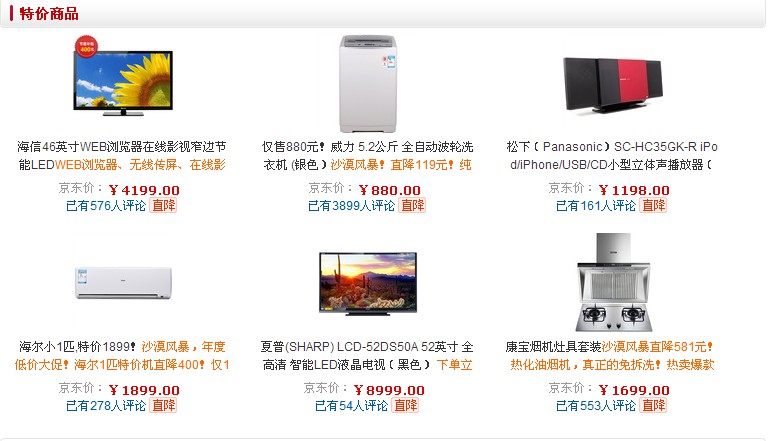白菜价格都会有波动,更别说更新换代这么快的电子产品了,时刻把最新降价了的产品展示给用户,这样做有两个好处: 1:在很多实店里,商品就算降了价,如果用户不了解行情的话,销售人员很少会有人主动提醒用户的;京东这里展示给用户,让用户感觉在这里买东西不坑爹,降价的产品随时都能看到,给用户一种安全感。 2:降价的产品,对用户的吸引力肯定是比较大的,毕竟每人喜欢买贵的东西。比如说上图中第一个产品,如果用户的朋友刚买了一个,价格是1999,他也正在考虑是否要买一台,那么此用户看到这个降价信息,他的购买欲望一定是无限放大的,虚荣心加上确确实实的降价,此单成交率一定在70%以上。