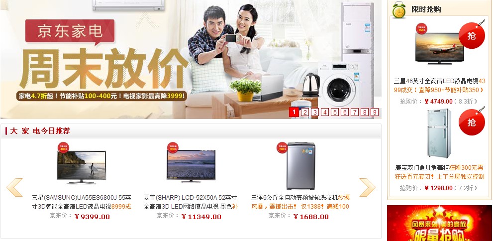幻灯片:分析了这么多页面,我们发现所有的分类首页都有很大的幻灯片,幻灯片的作用这里就不啰嗦了,几乎全是一些特价活动之类的,人们总是对商家的各种活动非常感兴趣的,加之其工作人员精心设计的幻灯片大图以及其极具诱惑力的专题活动页面,只要你是对这个产品有一定购买欲的,那你一般情况下是很难不下单的了。 今日推荐:京东推荐这些产品的依据是什么我不清楚,也没法弄清楚,毕竟我不是其工作人员,也不是POP商家。不过它的目的是很明确的,大家都能看得懂,所有人购物的时候都有一个同样的心理:如果其相信某一个品牌的话,那么它所推荐给你的产品你会考虑优先选择购买!很明显,来京东的用户基本上都是相信京东的,其推荐给用户的产品,用户对这些产品的信任度自然而然的会比其他同产品高一点,那么成交量自然也就高那么一点点。 限时抢购:限时二字很明显就是给用户一种紧凑感,这是所有商家惯用的一种手法,尤其在淘宝上被用滥了的。京东这个就用得恰到好处,来到“大家电”栏目的用户,肯定大部分都是对这些产品感兴趣的,当然感兴趣并不代表用户现在就需要啊,所以咱利用“限时”二字给他一种紧凑感,同时“抢购”二字进一步提醒用户,快去抢,动作慢了就没有了。