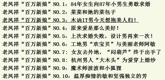 “老凤祥“百万新娘”在19楼整站中,是每周都会有一期节目的,然后在首页最醒目位置进行宣传,不得不说这完全就是对于栏目的影响力的宣传,相信很多人现在都上19楼看结婚,看婚庆,看各种需求,这种影响力,无论是对于赞助方还是其他,都是很有效益的,特别是在这些节目之中,都是通过直接宣传的模式来述说,而且从上面可能出现的男女主角中也可以感受一些这些和19楼合作的结构的作品如何哦,是考验自己的时候,但是同样也是一份最大的机会。 好了,19楼婚庆系列就暂时写到这里了,在以后的时候,还将继续分享19楼其他频道的建设,加油了,丰胸产品排行榜站长,,努力才是你最应该做的。 (责任编辑:admin) |