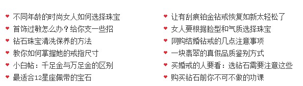在这张图中,我们可以看到这些都是结婚中的必须品,毕竟结婚一辈子只有一次,19楼用了大篇幅介绍了我们在结婚中所遇到的绝大多数的物件,包括影楼,摄影,西服,礼服,会馆,珠宝,如果你要结婚的话,这些都是不能缺少的。 通过这些我们从另一个角度也可以看到,婚庆频道中,盈利最多的就是结婚这个栏目,而且如何配合这些服务来实现盈利呢?于是乎就有了下面的软文介绍推广,如下图笔者截取的珠宝栏目的文字介绍