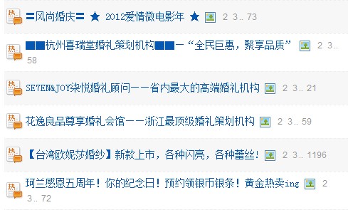 在这张图中,我们看到了一下几个比较重要的栏目,“我要结婚”,“婚庆服务采购区”,“四大金刚”,“婚姻加油站”,“婆媳关系”,“婚礼用品交易”,“爱在人间天堂”,这些栏目,从这些栏目中我们可以看到以下几点结婚很重要的细节性问题。 a)我要结婚栏目:我相信每一对正在恋爱的年轻人在以后的某个时候都会将结婚提上形成,每个人都希望自己有一段美满的婚姻,那么“我要结婚”栏目,就恰恰迎合了这样一种需求,在这个栏目之中,我们可以看到,很多关于结婚的帖子,有关于结婚的憧憬,有关于晒的大大的幸福,我相信在这样一个版块之中,每个人都可以找到属于自己的位置,还有那一份爱情的感动。 b)婚庆服务采购站:婚姻采购是每一位朋友都需要经历的事情,而且是我们精挑细选的时候,话不多说,直接上图