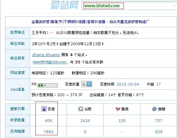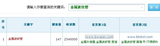 首先笔者通过站长工具查询了一下主关键词-金属波纹管,笔者以排名第二的站为根据进行分析。排在第一位在笔者看来并不稳定,而且通过站长工具查询看来,数据也并没有那么的正常,这完全出乎笔者的之外。看这个站的整体数据,收录量很高,以及强大的外链做铺垫,这正好验证了那句经典的术语“内容为王,外链为王”!