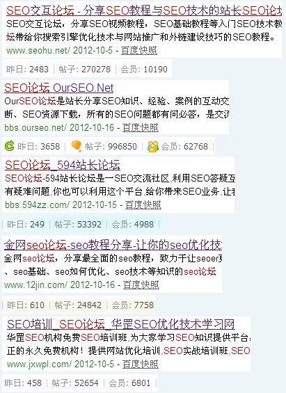 从这张图中,我们看到了这些网站一般都疏于管理,而且收录速度快这样一大类,然后在借助百度对于新收录24小时之类的页面有一定的加成作用,所以才有了如下的反应;但是如果说seo论坛被制造垃圾首当其冲,却很难说明问题,现在的预防作用包括,discuz都有很大插件可以解决很多垃圾信息的出现,在这一点之中,我相信作为seo研究网站的我们,对于这种应对是很有把握处理掉; 虽然在A5和站长网论坛之中都出现过很多垃圾内容,但是也是很快都处理掉了,一个正规的论坛都应该有非常好的反应速度,这一点毋庸置疑,如果说seo论坛被一些垃圾外链首当其冲的话,很多并不一定适合,毕竟如果满足收录迅速,权重高的条件的话,这样的seo论坛的管理一定很严格,然后大家细细数一下,到底有多少呢? 其次,驳斥 — “seo论坛盈利模式不明显” 我始终在想,如果每一个seo论坛都想着盈利那该怎么才能过好,seo论坛的盈利方式到底是什么呢?现在笔者试着百度一下seo论坛之中,排名比较好的,然后整理下会员数目(除掉seowhy),下图即收集