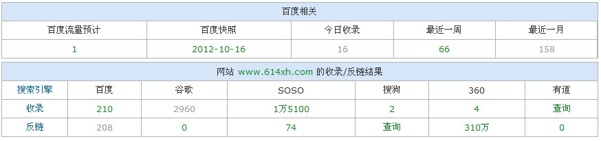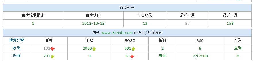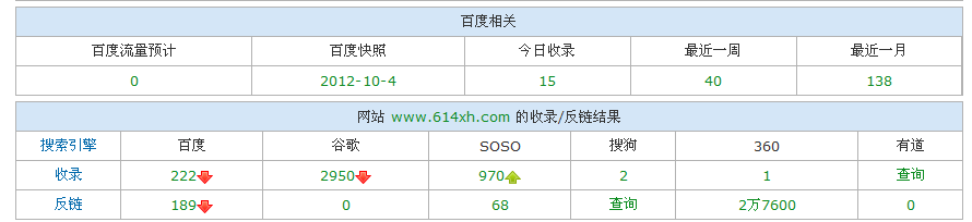 这是13日晚通过站长工具查询的结果: 百度收录量由上午的267直接掉至222,快照由10月13日回档至10月4日;谷歌收录量有轻微的变动,大约掉了十几篇文章;SOSO比较后知后觉,暂时无影响。我们再来看一下14日上午通过站长工具查询的结果: