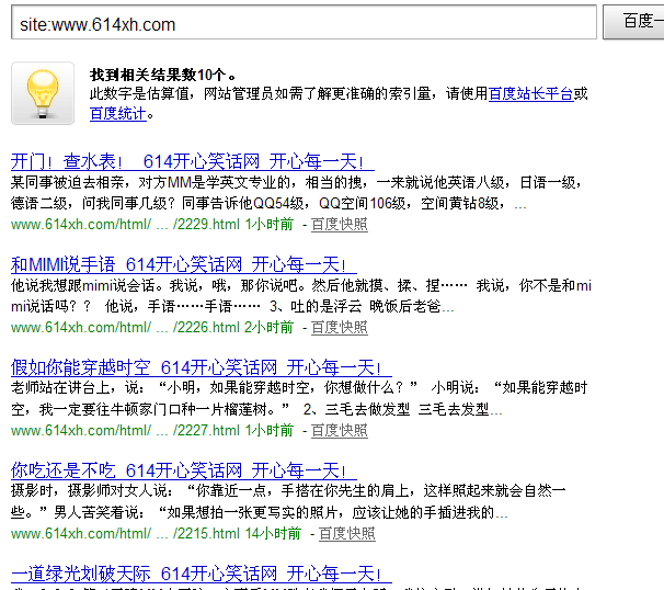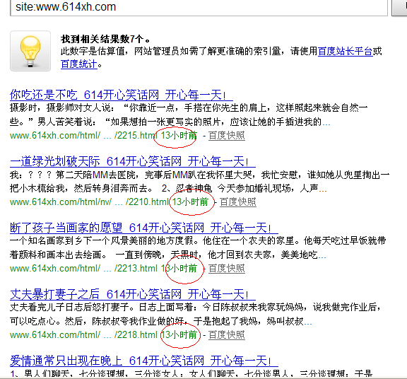 上以标记红圈的文章即是网站故障后丢失的数据,百度又重新收录。15日上午又继续更新几篇笑话,在15日中午查询收录情况后发现: