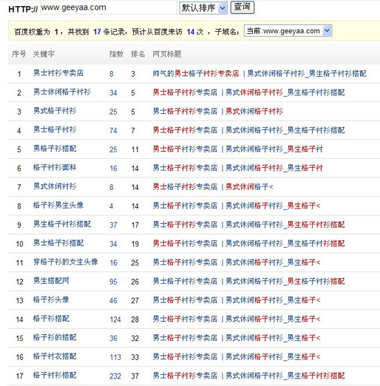 自己从事SEO优化已有一年多余,没啥技术含量,只是一个小白,正因为自己是一个新手,所以在优化的过程当中,一直遵循最基本也是最基础的优化方案:内容+外链,就是凭着这两个基本原理,也能把一些关键词做到首页。无论百度如何变脸,无论SEO行业如何动荡,SEO优化始终是万变不离其宗:给用户想要的,搜索引擎也会给你想要的。下面我就以最近优化的一个格子衬衫网站为例,说说我是如何以内容取胜,从而获得相应的关键词排名。 首先说明,这是一个被K之后,重新做的站点,标题和模板都换成了另外一个模样,最早的一篇文章是9月4日完成,9月5日也有一篇,之后就停止更新了,然后9月24日也更新一篇,之后再度停止,然后从10月15日开始了专业的优化,每天保持三篇以上内容的更新,到今天为止的5天时间里,我们看看有哪些关键词有了排名。 咱们先来看看15号这个格子衬衫网站的相应排名。