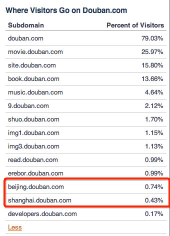 豆瓣同城以北京、上海、广州为独立二级域名访问,其中能统计到的只有北京、上海两地的访问数据,即为1.11%。根据豆瓣的百度指数显示出其他城市占比,大概估算豆瓣同城流量在豆瓣占比2.8%,即独立访问IP在10万量级。 活动酷
