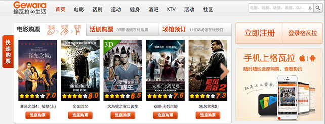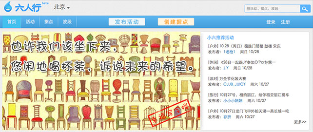 六人行始于05年,是很早一批独立做活动的网站。近期大改版,目前为新版测试期。流量和排名都不甚好。六人行包装了2个好玩的概念,即活动地点为据点,活动小组圈子为波段。 从Alexa查询活动酷流量数据得出综合排名 183,411 。 总结: 豆瓣同城定位于高端文艺型活动,偏主办方举办。 文艺活动+主办方 活动酷定位于运动交友型活动,偏活动社交。 小组+活动+找人 Plancast定位于全球性高端商务活动,偏活动社区。 计划+日历+分享 六人行定位于活动社交网络 活动+地点+小组+主页 2.2 票务类 格瓦拉生活网