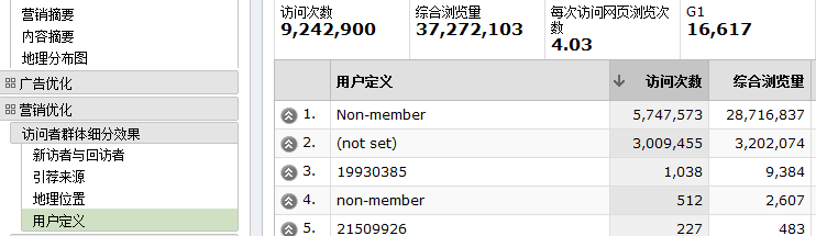 <form onSubmit=”__utmSetVar(this.mymenu.options[this.mymenu.selectedIndex].value);”> <select name=mymenu> <option value=”Technical/Engineering”>技术人员/工程师</option> <option value=”Marketing/PR”>营销/公关</option> <option value=”Manufacturing”>制造业</option> <option value=”General Management”>综合管理</option> 二、查看自定义访问者群体报告 在”营销优化”>”访问者群体效果”>”用户定义报告”中查看每个自定义用户群体的转换行为。另外,根据访问者群体,您还可以使用许多其他报告来交叉分析数据。要进行交叉分析,请点击”分析选项”按钮,在大多数报告中,该按钮位于条目的最左边。选择”用户定义”查看您自定义的用户群体。比如下面是利用setvar将用户ID灌入Urchin中: