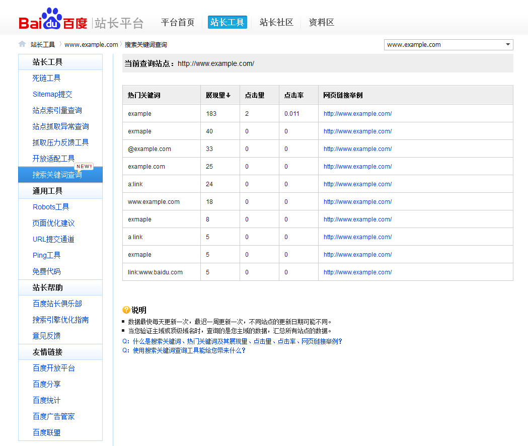 第一步,注册并登录百度站长平台() 第二步,提交网站并验证归属,具体验证网站归属方法可见帮助文档 第三步,选择左侧“站点管理” 第四步,在已认证归属的站点列表中选择需要查询的站点。 第五步,选择左侧“搜索关键词查询” 第六步,得到站点搜索关键词查询的数据 4、有奖征集工具后续升级建议 此次我们推出的是“搜索关键词查询”beta版,后续搜索关键词查询的定制功能以及数据量的增大都在考虑升级中,同时我们在社区和微博发出有奖征集升级建议,站长们期待的更强大的搜索关键词查询功能是什么,如果您的建议最终被我们采用,可获得百度站长平台准备的礼品一份(百度皮具四件套)。希望您持续关注百度站长平台,我们将不断升级推出更多重磅实用的站长工具,帮助网站运营seo,与网站共同成长。 »»转载请注明:诸葛诺|妖言惑众与蛊惑人心 »»本文地址: (责任编辑:admin) |