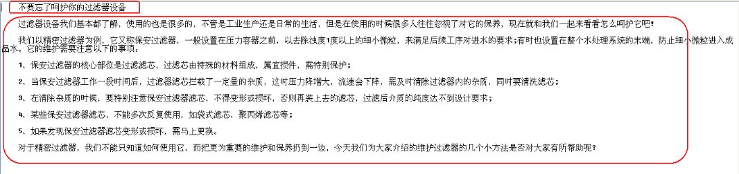 二、正文 站外文章的正文由开头、内容和结尾三个部分组成。 1、开头:文章的开头很重要,通常是搜索引擎蜘蛛抓取的重点部分,所以在建议文章的开头部分最好是高度伪原创或原创。主题要紧扣优化关键词进行编辑,同时需要做到将我们优化的关键词自然而然的插入到文章段落中。一个好的文章开头要让大家在读完首段之后就能够了解你想要表达的意思和内容,能吸引读者往下看。通常我编辑的文章开头部分,我都会尽可能的采用原创的方式进行编辑如果难度较大的话或者是专业性较强的一些知识点,那我可能就会采自己的表述方式进行编辑,这样可以很好的保持文章的首段原创度。同时文章的首段编辑需要围绕整篇文章的主题进行开展,如过滤器新闻编辑,首先我会总体的介绍一下目前环境污染的态势,然后提出过滤器在污染治理中发挥了什么作用,然后再引出正文,在这其中自然插入关键词“过滤器”。 2、内容:文章的正文是一篇文章的的主体,通常我们编辑的站外文章因为考虑到时间以及成本的关系,我们编辑的外链文章通常采用的都是伪原创的,所以我们的seo软文专员在编辑站外文章(外链文章)时针对文章的中间部分的修改力度相对较小,主要就是看看其中有没有错别字或者语句不通顺的地方,段落顺序以及表述方式上面进行一些简单的修改。就我个人而言通常搜索引擎蜘蛛在检索一篇文章的时候可能也就只会抓取开头和结尾两个部分,在外链文章方面做到高度伪原创也就可以了,能够做好原创当然是最好不过的,因为我们不仅要考虑搜索引擎的检索还需要考虑用户的体验度。外链文章的原创还是伪原创还需要给位seo站长们结合自己优化网站的实际情况而定。 3、结尾:通常提到一篇好的文章要做到首尾呼应,那我想文章的结尾的重要性也是不言而喻的,在这里我建议各位seoer们最好还是自己原创的比较好,通常文章的结尾可以将整篇文章的观点进行总结,当然能够使用一些疑问或反问句式是最好的,可以给读者留下一些想象的空间。当然也不要忘了插入我们优化的关键词!我编辑的文章尾段通常我会对整篇文章进行总结,并且在最后提出一些问题,引起大家的思考。(与开头的图片相呼应) 下图是我运用以上的方法编辑的一篇站外文章,发布到各大个平台中收录还是比较好的,当然平台资源的权重是一部分,我想能够被收录这与文章的量也是有一定关系的。