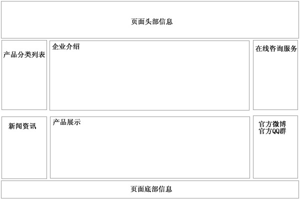 大家好,我是梁磊,用户体验与页面设计息息相关,可以说页面设计是用户体验中很重要的一部分,然而很多网站其实并没有深入挖掘页面设计能给用户带来什么,尤其是如今互联网抄袭现象普遍,能在用户感兴趣的往往是哪些页面设计风格独特,或者交互性强的网站。模仿是可以的,但是不能一味的抄袭,直接复制、粘贴就OK了。企业站页面设计千篇一律,做网站的时候直接复制个网站模板,然后稍微修改下就算完工了。那么企业站页面该如何设计呢?笔者以为针对同行业的网站模板,我们可以遵循“求同存异”的原则,先看下企业站普遍的首页设计草图: