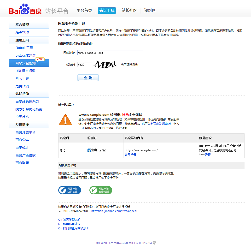 站长网(admin5.com)10月24日消息:昨日百度站长平台发布最新“关于超链作弊的算法升级”的公告。针对综合数据分析出的问题和用户及广大优质站长反馈的意见,对百度反作弊算法进行再一次的更新升级。本次百度系统算法升级,打击的主要对象为意图通过超链作弊的方式操纵网站在百度搜索结果中排名的行为。百度还对超链作弊进行了举例。今日百度站长平台网站安全检测工具升级上线,表示网站被黑会影响网站在百度网页搜索中的体现,提醒站长防范。 百度算法升级打击超链作弊,对于站长和SEO工作者来说影响巨大。以往通过黑帽SEO等行为进行优化的网站,将很难再获得理想的收录和排名,甚至存在被黑的风险。安全检测工具升级再度提醒网站存在安全问题也将会影响用户体验和搜索引擎排名,站长应及时对网站进行安全监测。 各位网站管理员: 近期接到较多网站管理员反馈,当发现网站在百度搜索的结果里显示被黑后(“百度提示您:该页面可能因黑客侵入存在安全风险”),不知道具体哪里被黑,无法定位问题修复网站,非常着急无法快速修复问题,造成搜索流量和网站用户体验的双重损失。故我们对网站安全检测工具进行了升级,新升级的工具可以检测出网站被黑的详细类别,包括挂马、钓鱼、欺诈、违规内容,同时还有针对这些被黑的详细修复建议,让站长能够在最快速的时间里解决网站安全问题。网站被黑严重影响了网站运营和用户体验,同样也影响了搜索引擎的体验,解决被黑问题刻不容缓,百度安全联盟伙伴有千万级别的恶意库,保障百度搜索用户的访问安全。 网站被黑会影响网站在百度网页搜索中的体现 当网站管理员发现网站在百度网页搜索的结果里显示有风险后,可初步判定为该网站被黑,通过本工具来查询您的被黑的详细类别以及修复建议,尽快帮您定位解决问题,当您解除被黑状态,百度检测网站正常后(需要一定的时间和系统流程),网页搜索结果里的风险提示也会相应取消。如果网站频繁被黑,或被黑后如黑客发布大量对用户有损伤的内容,百度网页搜索也会在一段时间内降低对该网站的体现,避免用户受到黑客攻击网站的负面影响。希望网站用好网站安全监测工具,尽快修复被黑状态,保证网站的正常运营及用户体验。 如何使用网站安全检测工具 第一步,注册并登录百度站长平台 第二步, 选择左侧“网站安全检测工具” 第三步, 输入要检测的网址,可查看网站是否存在安全风险 第四步,如果站点存在安全风险且已在站长平台验证过站点(提交网站并验证归属,具体验证网站归属方法可见帮助文档),可以点击查看被黑详情