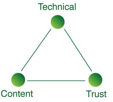 图的目的是解释我们所看到的是seo三个基石因素,你将在搜索引擎获得排名的三个重要方面,这些因素相互密切关系,如果你其中一个因素稍弱,那么你将不可能在搜索引擎中获得好的排名。