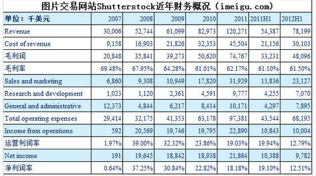 2,提价空间较窄 Shutterstock主要采取的是批量微利模式,用户为每张图片平均支付的费用为2美元,这种低价策略使得客户对其的需求和交易量扩大,然而提价空间较窄,所以未来发展空间主要在于提高图库数量和下载量。 但是,当各大图库的内容越来越同质竞争的时候,原本已经微利的图片在线交易模式如何能保持持续增长值得思考。 3,本土化挑战 Shutterstock目前的活跃付费用户超55万,所在国家和地区超过150个,日益成为一个全球化的公司,业务区域范围的拓展主要为了刺激图片供应量和付费下载量从而刺激营收利润增长。 不过由于上面所说的该行业门槛较低,业务全球化的同时必然会遭遇到各个市场本土公司的激烈围堵。而且,在与本土公司竞争中有不止两方面的劣势:一是缺少本土内容积累;二是缺乏良好的本土供应方和客户关系,这两方面都需要较长时间的积累。 以中国为例,图库网站比如CFP、全景图片、东方IC等等也层出不穷,在内容和客户资源方面已经积累了相当多的优势,全球最大的图库公司Getty Images进军中国采取的是与中国公司视觉中国(VCG)合资建立公司华盖创意,合资公司一方面可以在中国代理Getty巨大的图库资源,另一方面也与亚洲及中国本土的优秀摄影师紧密合作,持续补充大量优质的中国元素内容,满足客户的多样化需求。 目前Shutterstock网站也有中文服务,不过优势并不明显。 四 增长策略 由上述的分析可以看出,Shutterstock微利图片交易模式的提价空间较窄,那么未来增长策略就主要在提高图片交易的规模,加强营销、提高用户体验和加强本土化的目标都在于此;此外还包括开拓录像等新内容和媒体机构等大客户。 1,增强线上和线下营销:目前Shutterstock的客户增长主要来源于人际传播,且活跃的中小企业(SMB)客户在全球中占比份额很小;未来计划扩大图库供应量以及提供特殊服务来继续营造良好的口碑,此外也将通过增加线上和线下营销投入来扩大品牌的知名度。 2,提高原有用户体验:通过不断积累的图库资料、用户浏览和下载习惯,以及对市场和用户需求的把握,Shutterstock继续提高搜索算法的质量和用户体验,此外为图库供应方提供更多工具,使得他们对自产内容进行更好的管理和跟踪等,发布新产品增加供应方社区之间的关系,并不断吸引新的用户。 3,加强本土化:Shutterstock日益成为一家全球化公司,内容的供需方的范围超过世界150个国家和地区,网站的语言版本有10种,计划提高用户体验,深化全球渗透率。此外,本地相当大的需求尚未开发,计划增加供应内容和地区的丰富性,从而满足全球化用户的不断增长的需求。 4,拓展媒体机构和大企业客户:截止目前,Shutterstock大部分营收均来自于中小企业的在线购买行为,而来自大企业或组织的营收少于10%;计划通过提供灵活的支付方案来针对大企业进行直销,从而增加营收。 5,开拓新的内容类型:目前,除了电子图片外,视频短片或录像等的市场需求也日益增长,Shutterstock将不断拓展新的电子内容领域,为用户提供更多内容。 五 财务解读 以财务解读来反观商业模式,Shutterstock收入分成、批量微粒模式的关键在于提高付费下载量,从历年财报解读可以看出,其付费用户、下载量以及每下载平均营收均实现增长,从而促进营收和利润增长;且来自图库行业发展较成熟的美国和欧洲市场的营收占比历年来分别为30%和40%左右。 1,营收和利润增长动力:付费客户、下载量和每下载平均营收增长 营收从2007年的3000万美元到2011年的1.2亿美元,保持41.49%的年复合增长率,2012年上半年营收同比增长43.78%至7819.9万美元。 历年来营收的增长,主要是由于付费下载的数量以及每下载平均营收增长,付费下载数量增长主要由于客户的增加,每下载平均营收增长主要是由于按需定制的增长。