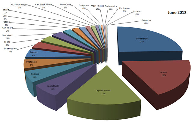 运营现金流由由2009年的2715万美元增至2011年的3955万美元;其中来自净利润的现金由2009年的1884万美元增至2011年的2186万美元;来自递延收入的现金由2009年的394万美元增至2011年的882万美元,递延收入来自用户通过付费计划中的订购或者按需模式提前支付的购买费用。 三 投资风险 Shutterstock风险主要体现在同质竞争激烈、本土化挑战和提价空间较窄。 1,同质竞争激烈 Shutterstock所在的电子图库行业门槛相对较低,从内容供应方来说,事实上大多数以图库生存手段的的内容供应方(摄影师、插图画家、摄像师等)会在多个图库上传内容,通过图片的多次售卖与图库网站销售分成来获得更多的利润。 来看看一个摄影师在2012年6月来自不同图库的收入占比数据(如下图所示,来源),摄影师在不同图库取得的收入与其上传的内容数量、网站的分成模式以及销售等各种因素相关。