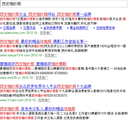 一、从简到难 关键词有难易之分,小编的策略是先优化简单的词开始逐步优化徐徐渐进。这样操作的好处是,简单的关键词排名容易上,当简单的词上去之后网站会积累一定的流量从而会贡献点击权重再去优化较难的词就比较容易一些。如果一开始就去优化竞争较激烈的词,优化周期长而去不容易出效果,客户问起来也不好回答。天下难事必做于易,天下大事必做于细。 二、平台互动 很多站长只把更新文章和发外链认为是seo,其实微博、SNS、QQ空间等平台的互动引导也可以对seo起到很大作用。我们可以在互动平台上面发布优惠活动然后通过描述引导用户去搜索我们的网站从而增加点击权重促进和稳固排名。 三、线下线上 很多企业和站长认为线上和线下是分开的,这是非常错误的认识。那是因为他找不到将线上和线下进行良好的衔接,网络销售对于我这个客户来说只是销售的一部分,他们更多的客户来源于线下宣传。但有很多用户没有时间在线下进行互动参加活动,那么我就建议客户在线上也进行活动,在线下宣传册中提供线上参与活动的方式和网址,这样线下和线上良好的结合起来了。 四、差异化宣传 在本地论坛、婚纱摄影论坛、博客等地方进行差异化宣传,看看下图西安本地的婚纱摄影机构宣传方式大都相同吹嘘自己有多么多么好,实则暗请模特充当客户忽悠人而且照相风格互相抄袭。虽然我的客户是一家刚开的工作室,但客户是一名资深摄影师非常爱好摄影,相机是他的知己、相片是他的心血。这样与那些以盈利为目的的机构很明显的区分开来,在众多网站中最醒目,最容易让用户记住和点击的。