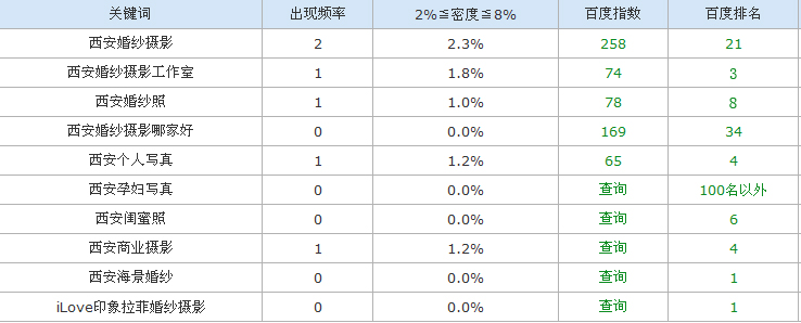 还有就是这个网站唯一一块文章更新区就是首页的最新活动,既然定义为最新活动那么就不能更新其他内容了,这样就跟没有文章更新区一样。虽然是图片站,但百度还很难理解图片展示的内容,要想获得较好的排名不单单要满足用户的需求还要考虑百度。 就是这样一个坑爹的网站,小编费劲九牛二虎之力终于将客户选择的关键词优化至百度首页,排名如下图所示。下面就分享一下西安婚纱照优化的方法和思路: