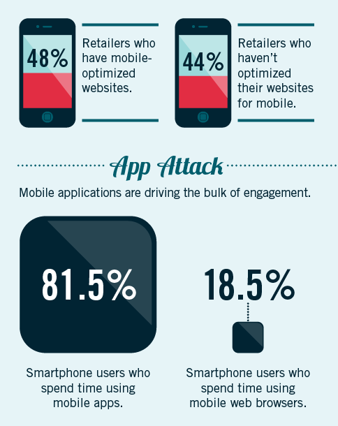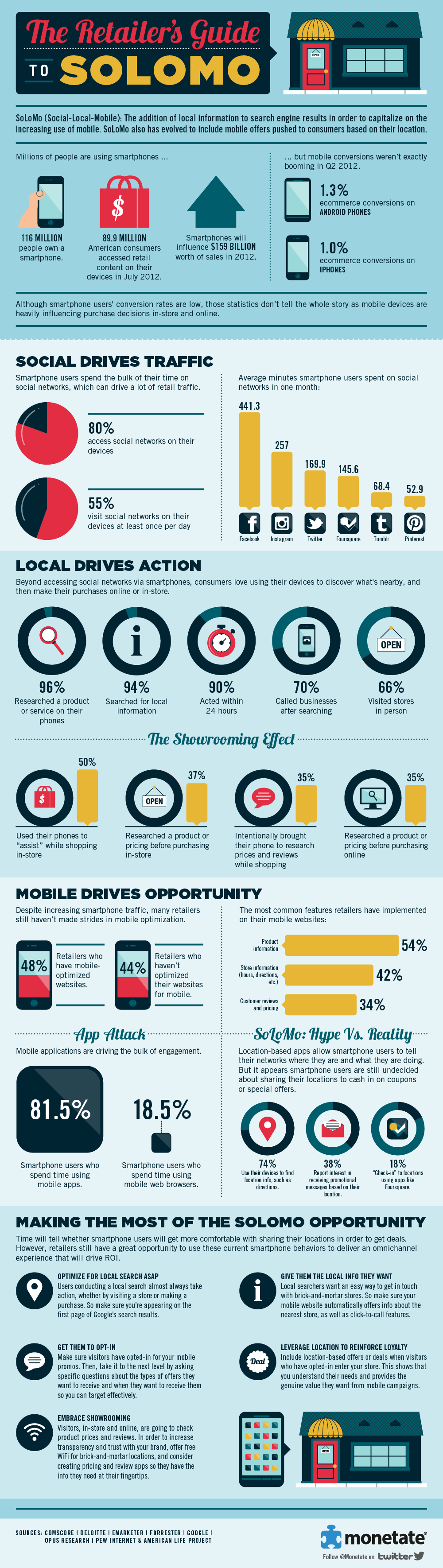“业界突然觉得 O2O 是不是很新的概念,炒得很火热。但这只是基础的能力,它本身不具备完全独立的产业。所以说开发者们应该把这个作为一个基础能力之一,而不是说只做一个应用产品就是二维码或者是 O2O,这个太狭隘了。因为这会很普遍地存在于所有的 App 里面。你们更要关注的是垂直的很深入的服务领域,能满足人们某一方面的要求。” 当马化腾能把话讲得这么明白的时候,说明腾讯已经在这件事情想得已经非常清楚了。由于演讲的主题是开放平台,所以是从“经验之谈”角度讲的这番话,建议开发者往垂直领域钻研。而在今年 5 月全球移动互联网大会(GMIC)上,马化腾讲到腾讯战略就没有那么客气了,当时他说腾讯专注于 SoLoMo、照片、Voice、手机安全四大领域,几乎是告诉对手和开发者不要在这四个领域跟腾讯正面竞争,否则他们会使用力量捍卫自己的核心战略。 当然,今天不谈腾讯。谈 SoLoMo,与小马哥所建议的“扎根垂直领域”有关。国外的市场推广机构 Monetate 根据 comScore、eMarketer、Pew 等机构的公开数据整理了一份信息图,教实体商店如何适应 SoLoMo 浪潮。 虽然 Monetate 的建议对应的是美国市场环境。但考虑到美国移动市场发达,它的风向代表着全球移动市场的发展,所以这幅信息图还是很有参考意义的。比如它所提到的搜索周边商店与发生购买行为之间的比例,国内商家在布局 SoLoMo 时可以参照。 商家适应 SoLoMo 为时不晚 目前美国 3.1 亿人群中 1.16 亿人拥有智能手机,这些智能手机会影响 1590 亿美元规模的相关产业。而截止今年 7 月,美国消费者人群中有 8990 万人会在购买商品前通过手机浏览了解。不过,智能手机与零售店还没有很强的关系:只有 1.3% 的电子商务交易来自 Android 手机,1.0% 的电子商务交易来自 iPhone。这个比例在中国应该会更低,意味着这个领域大有机会。 在地图上标记你 用户行为调查数据显示。96% 的人会有他的手机上搜索某个产品或某项服务,70% 的人在搜索之后会产生交易,66% 的人会根据周边搜索到的地理信息登门光临你的商店。所以你一定要快点在 Google Maps(百度/搜狗/高德地图)等地图网站标注你的商店信息,以便你的店铺能很方便地出现在你周边那些人的手机上——更别说摇一摇这种功能大大简化了基于“local”的搜索。 除了一步到位地在各种地图网站标注你的店铺信息外,你也要尽量在店里提供 WiFi 网络。因为研究表明有一半的人在店内购买的时候,会把它的手机视作“助理”,在上面查找产品信息、价格。以往他们会通过短信或电话来问亲戚、朋友,现在他们通过搜索引擎或点评网站来询问网络,所以管理好点评类网站也是必修课程之一。 优化移动版+App,适应移动化浪潮 根据调查数据,48% 的零售商的网页为手机移动版做了优化,另外 44% 没有作优化。这些零售店的网页中,被展示得最多的依次是:产品(54%),商店信息(42%),评论和价格(34%)。看来大家对于价格的魅力的态度有所保留。