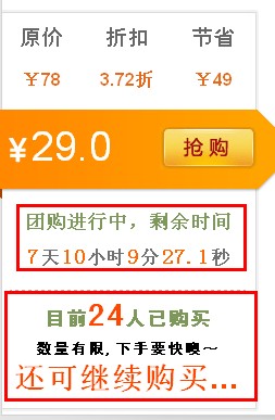 三:创造产品热卖、紧俏的气氛 我们都知道逛团购网的人除了喜欢低价外,有的时候会有跟风的心理。这点我们可以从现实生活中大卖场的促销中见到,如果我们看到大卖场排队进入时,虽然我们并不知道在促销什么,但是我们也都会自觉的跟着排队,因为谁也不想错过优惠的东西。针对消费者的这种跟风心理,我们可以在我们的团购信息上营造一种产品热卖并且商品紧俏的气氛,让消费者有种现在不赶紧购买就要断货了的想法。这一技巧我们可以在商品的销售信息上显示已售出的商品数。或者打出“数量有限,下手要快噢~”来刺激消费者购买。