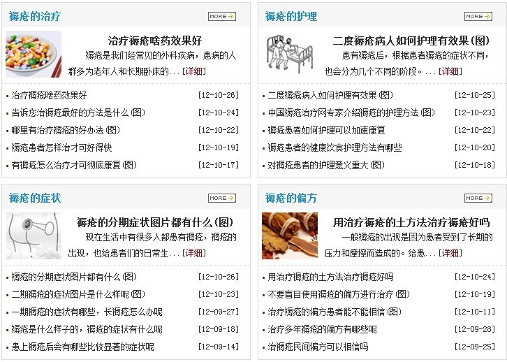 其一:网站整体布局非常美观,非常注重网站的站内优化,使用户体验度达到一个非常高的水准,各种颜色搭配和图文并茂,给人一种视觉上的享受,利于用户阅读 其二:网站文章内容,原创性非常的高,基本每篇文章都是独家原创,由于之前做的是实体医院,在医疗知识上面有着非常雄厚的基础,加上之前掌握的各种褥疮病例,稍加以整理,都是源源不断的原创性资料文章,可读性非常高,不是一般的伪原创文章可比 网站的站外优化