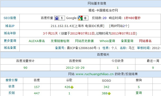 过去几天,恰巧碰到百度关于超链作弊的算法升级,影响力一步一步扩散开来,估计百度的数据库太大,在笔者写这边文章的时候,估计算法升级的影响还在进一步扩散,因此笔者在各大站长论坛看到,关于此次算法更新的抱怨文章,成为当下的热门话题,为什么每次百度算法更新,都有那么多人在那担心呢?其中原因笔者不必多说,想必大家自己心里知道。今天,笔者给大家带来一个通过正规SEO如何让新站上百度首页,并且在最近三个月内的百度任何算法更新中,都稳步提升排名,希望在这动乱的关键时刻,能给大家提供一些经验 网站的综合概述 笔者这次为大家带来的实战讲解,是一个通过正规优化上来的医疗类网站,其实很多人都在那说,医疗类网站容易被K,容易被百度和谐掉,这只不过是某些人的说辞,因为难做,更将体现的是实力与技术,所以行内有句老话,优化行不行,高低在医疗 首先通过张截图来看下,网站一些基本情况