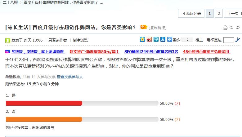 对10.23日百度网页搜索反作弊团队发布的公告,百度反作弊算法更新升级,目的是为了打击意图通过超链接作弊的方式操纵网站在百度搜索结果中排名的行为。之后站长网,a5,微博上诸多文章,也有支招的,看到有人在论坛上做了个调查,“百度升级打击超链作弊网站,你是否受影响?”