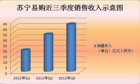 根据苏宁发布的财报,其前三季度收入达95.56亿元,而这较其今年200亿的销售目标相距甚远,还剩一个季度,苏宁易购要完成这一目标已经很难。 根据苏宁发布的第三季度财报,该公司线上业务(苏宁易购)实现销售收入95.56亿元(含税)。2012 年 1-9 月,公司实现营业总收入 724.31 亿元。 目前其线上业务约占其总体销售收入的13%。 今年第一季度、第二季度,苏宁易购分别实现了19.23亿、33.57亿元的销售额,依此计算,苏宁易购第三季度销售额为42.76亿元,环比增长27.4%,较上一季度环比74.6%的增速放缓不少。