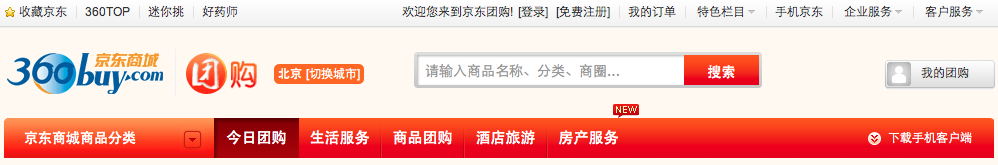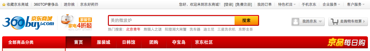 图10:新华网首页(截图时间:2007-12-10、2012-09-18)。值得一提的是,现在南方周末已经改用当年Times的主色浅灰色,而新华网延续了传统的红蓝色调。 二、无序 国人对于秩序、规则甚至法律的态度层次比较复杂,相比之下严谨的德国人和刻板的日本人显得似乎有点头脑简单了。曾有人戏言如果当年韩非子不是被妒忌他的李斯害死,中国现在就是法制社会了。这是玩笑话,但是中国千年来道德约束和集权统治的影响远远大于法律制约,这是事实。拿我们每天必须面对的交通来说,机动车常常突然出现在人行道,电瓶车在机动车道上横冲直撞,行人则在不同车道上悠闲地漫步。这种无序的状况一方面是法律的不健全和执法的不严谨所致,更重要的是国人普遍没有遵守秩序、维护法纪的习惯,而更多的是如何利用漏洞和缺乏监管某私利,或是成为凌驾一切规则之上的特权阶级,因为另一方面,等级森严、过于注重个人私利(同时不愿别人得到的利益高于自己的)、无社会责任感,也是国民千年来的特性。 真实社会的无序性导致了虚拟生活的无序,我曾经为多个不同类型的网站和在线系统做过可用性测试,其中一个屡见不鲜的问题就是缺乏统一性,只要产品的结构层级变深或变宽,最基本的导航的统一就十之八九无法做到,更不要说步骤条、字体、文字缩进、间距、翻页、按钮等其它细节。随手翻了一下京东商城,头部的导航就不一致(图11):