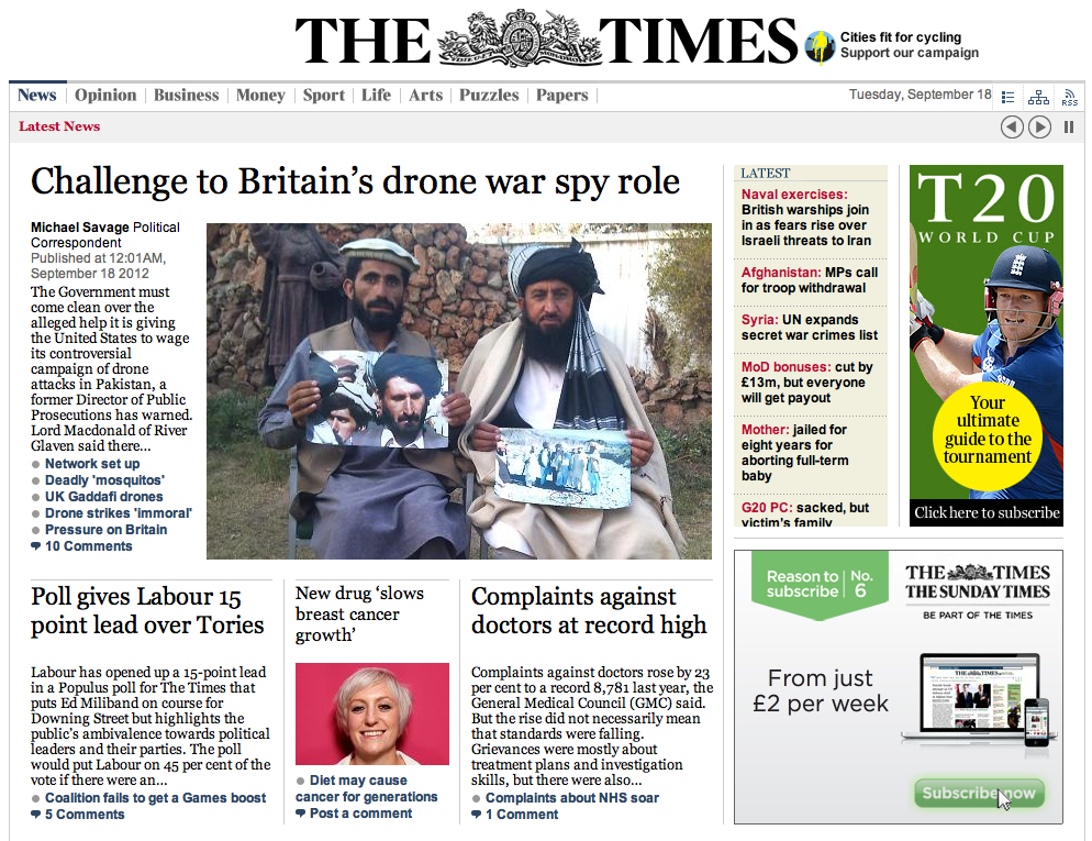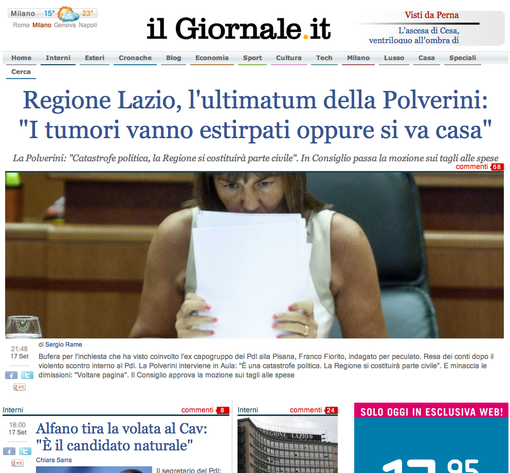 图8:意大利新闻报《il giornale (Newspaper)》首页(截图时间2012-09-18) 英国因为选择的是比较严肃和国际化的《泰晤士报》和《卫报》(图9),主页的主打内容大多是国际政治方面的新闻,特别的是体育新闻占14.89%,其它三个国家的前三甲都不包括体育新闻。