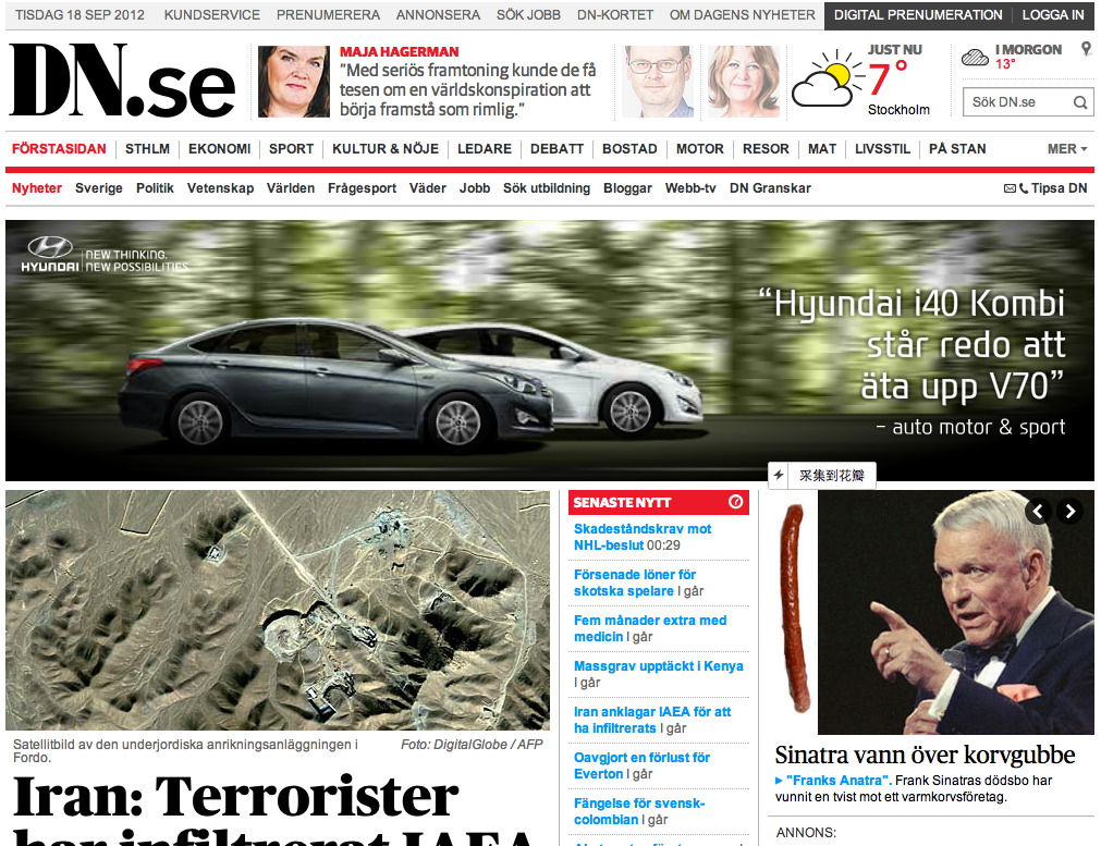 图7:瑞典的《Dagens Nyheter (Daily News每日新闻)》的网站首页(截图时间2012-09-18)