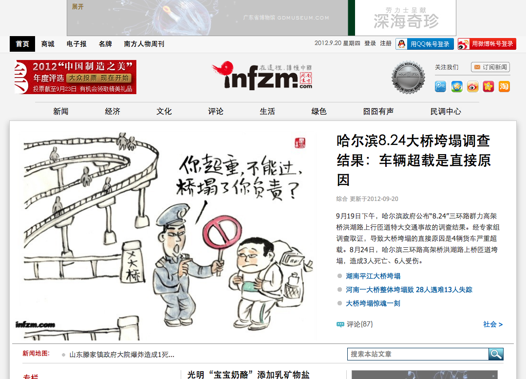 图6:《南方周末》网站首页(截图时间2007-12-05、2012-09-20)几年来风格有变,主要位置的话题类型不变,一直偏重国内社会负面新闻 瑞典和意大利则由当地大学生推荐的生活化报纸《Dagens Nyheter (Daily News)》、《Aftonbladet (Evening Paper)》和《il giornale (Newspaper)》《Corriere (Messenger)》(图7、8)。发现意大利人尤其钟爱娱乐新闻,占了三分之一之多,而瑞典的报刊话题比较均衡,社会、政治、娱乐新闻为前三名。