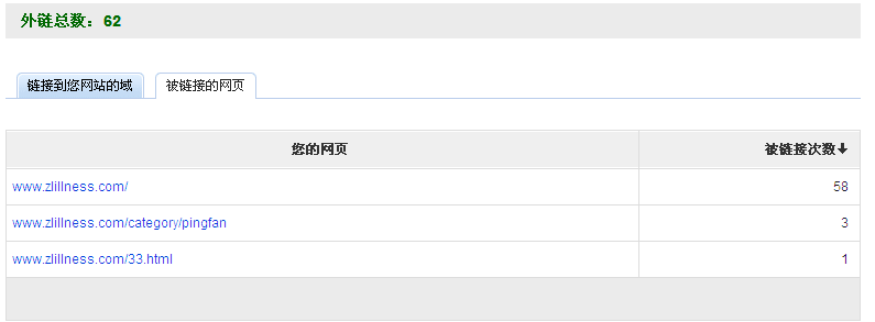 百度站长平台在不断完善中,就是10.30日百度站长平台新推广的外链查询工具一下,而且今天A5版聊嘉宾胡蓉也说到,百度站长平台还会不断改进,据说外链查询工具会在本月升级,站长们可以多关注一下百度站长平台了。下面笔者就以自己的网站来说说百度平台的外链查询工具的几个看点。 看点一:通过百度站长平台外链工具,我们可以看到链接到你网站的链接域名 这里包括链接到你网站的外部链接的链接页面,比如你在一个论坛发过文章,而且被百度收录了,这里我们就可以看到了。比如我的网站查询到外链总结是62条。