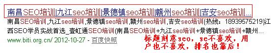 Seo有一句说到烂的老话:内容为王,外链为皇。正因为众多seoer对这句话产生了误解,才导致如今互联网垃圾满天飞,于是百度一怒之下,让外链不再为皇。同时也因为蜘蛛对原创的识别能力不够,导致“内容为王”也成为了一句空话,那么谁来当这个王呢?babyliu认为,新时代的seo应该以自然为王,未来的seo也即将随着这个趋势而发展。 什么才是自然?自然就是不去刻意人工修饰,而让其顺应时代去发展,babyliu对seo的所谓“自然为王”的理解是:不以seo为目的去做seo。是不是很矛盾?哈哈,下面请听babyliu细说如何才是真正的纯自然seo。 No.1:不滥用三大标签去刻意做排名,要创造符合用户体验的标题 三大标签曾被称为seo的三件法宝,通过三大标签的巧妙设置,能够让排名迅速得到提升,但是这样的时代已经一去不复返,babyliu为了证明这个事实,特意以“seo培训“这个词截了两个图让证明给大家看。