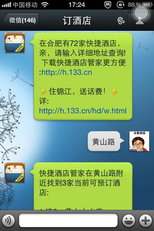 另外一款率先接入微信开放平台API的是由快捷酒店管家推出的订酒店微信号,由于是非认证,所以只能输入:innteam 添加微信,但是该微信号确实实现了微信开房的模式,提出微信开房,只需3步:①点击聊天页面底部的“+”,选择位置图标; ②拖动地图确定位置,点击右上角的发送; ③直接拨打电话去开房!笔者亲自尝试发现确实方便,比如我输入合肥,就会出来合肥相关的酒店清单链接,然后可以再输入黄山路 那么就会快速找出黄山路有的三家酒店,当然目前还只能通过电话订房,后期相信会直接打通支付模式来开房。