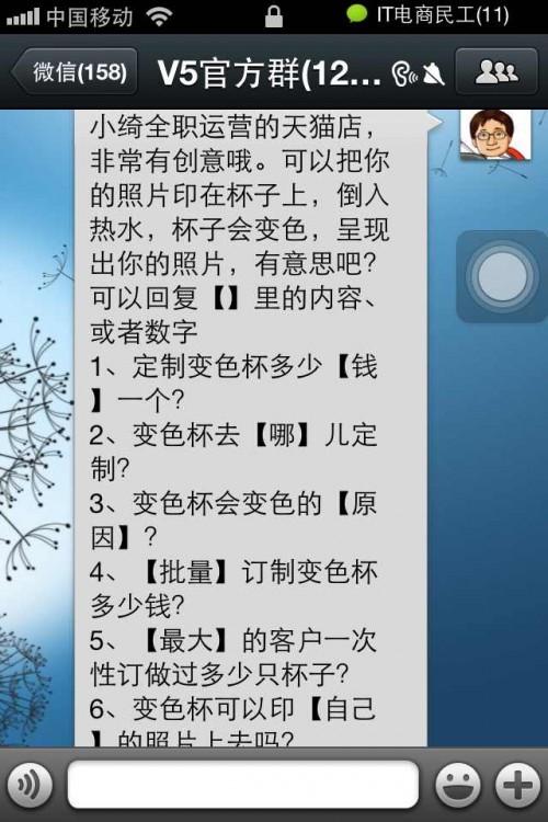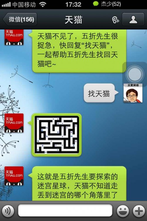 另外近期天猫的双十一活动,各种宣传全面启动,声势浩大。所以这次不免俗也通过目前最火热的微信平台来推广。并且策划了五折先生的概念,运营者通过微信的自定义回复功能,让天猫微信号的粉丝们参与互动。从找天猫开始,到迷宫,回答问题,逐步提升,最终只有幸存则来完成闯关游戏,获得大奖,从而取得很好效果。不过由于总共只能设置200条回复,所以运营中还是有一定局限性,所以微信公众平台对于第三方的自定义回复开放就尤为重要。