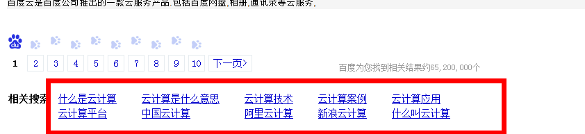 大家看一下图片,当我搜索云计算的这个词的时候百度所能提供的词,貌似并不是很精准,那么们就要针对这些不精准的词来挖掘一些潜在的客户,这里笔者周旭昇为大家介绍的只是一个思路,一个选择关键词的方法,并不能代表的很精确,望大家海涵!如果大家以后自己做网站在选择关键词的问题选不明白了可以百度一下沈阳seo顾问,找到我的网站,网站上有我的联系方式,随时为大家提供免费的顾问咨询!这里为了更好的介绍优质的内容,就不添加广告与联系方式了! 4.通过百度的相关搜索来挖掘一些关键词;上面我们介绍了百度的下拉菜单挖掘关键词的方式,当然了,百度的产品固然好,一定要好好的利用百度的产品!笔者周旭昇一直都是这么认为的,下面我们利用的还是百度的产品,相关搜索!如果有人不知道的话,那么我们就来看看吧!如图: