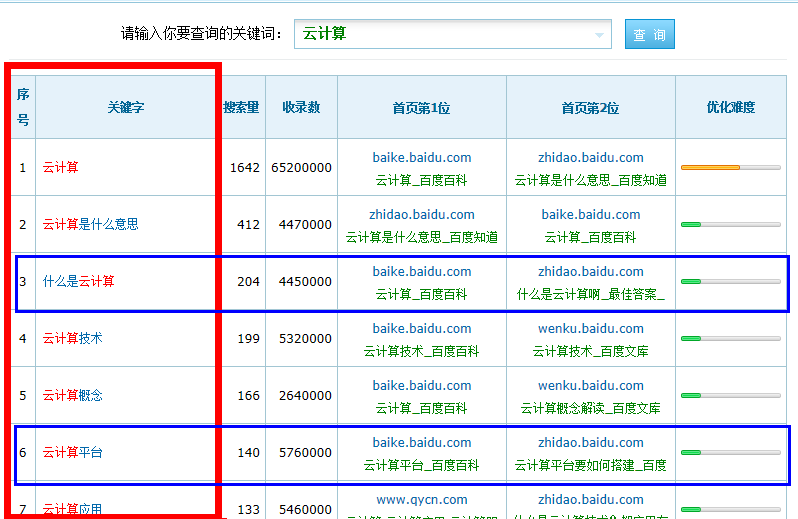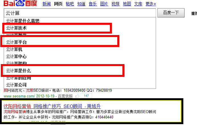 这张图是笔者周旭昇用站长工具查出来的,算不上太精准,但是可以参考一下,红色线圈住的是有关于“云计算”这个关键词的搜索结果,蓝色线圈的是我想要选择的关键词,“什么是云计算”!笔者周旭昇认为,能够搜索这个词的代表着他想了解这个云计算,并且他应该是度过本科以上的学历,不然也不会知道云计算的这个词,可以定义为我们的目标用户;还有“云计算平台”这个词笔者周旭昇认为也是非常精准的了,能够搜索这个云计算平台的人大多数应该也都是了解了云计算,想找一下云计算平台去学习的!所以他的站也可以选择这个关键词! 3.通过百度下拉菜单来挖掘关键词,seo是基于百度的基础上来做的,笔者周旭昇是这么认为,纯属个人意见,那么我们也要用百度的产品来挖掘一些长尾关键词!利用百度的搜索框的下拉菜单来挖掘关键词如图: