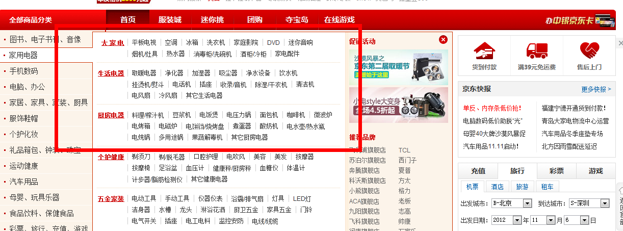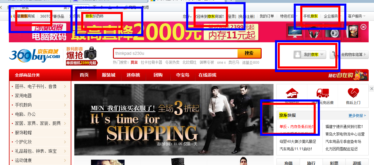 关键词的布局是为了增加网站内容与用户搜索词的相关性,这一点不用我说大家也都知道;网站的关键词基本都是根据用户的体验而定,常搜索的那些词,而且布局也很重要,京东商城的关键词布局很巧妙,在首页的每一个地方都有关键词的布局,标题,描述,顶部一栏,导航,分栏等等!遍地都是关键词;如图: