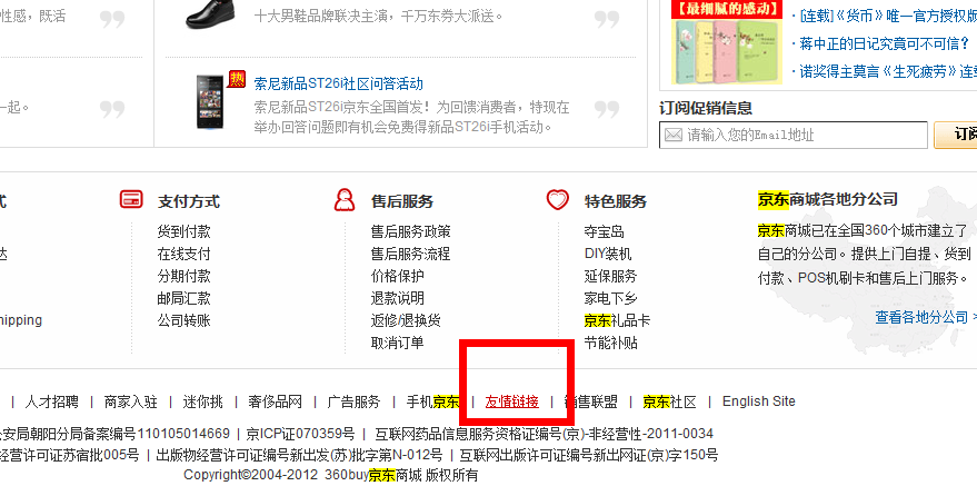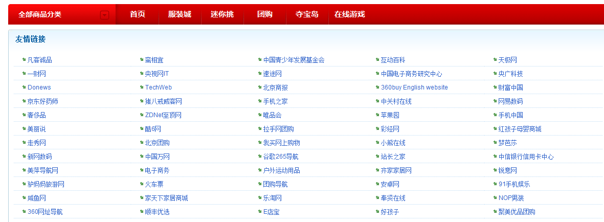 像这种大型的网站都不会在首页直接设置友情连接,他们都会在内页里面去设置友情连接,因为他们注重品牌形象,如果在首页的底部设置了友情连接,那么会影响网站的整体形象;所以他们就把友情链接加入到内页当中; 6.内部连接如图: