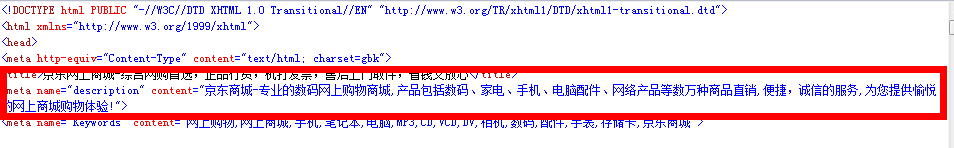 这样的电商网站首页的标题并不用像企业站那样去做,还要讲究布局之类的,不需要那么做,只要能够突出网站的卖点,给人一目了然的感觉,让人一看标题就知道你是做什么的!京东商城就是秉着这个理念设计的标题! 2.首页的描述如图: