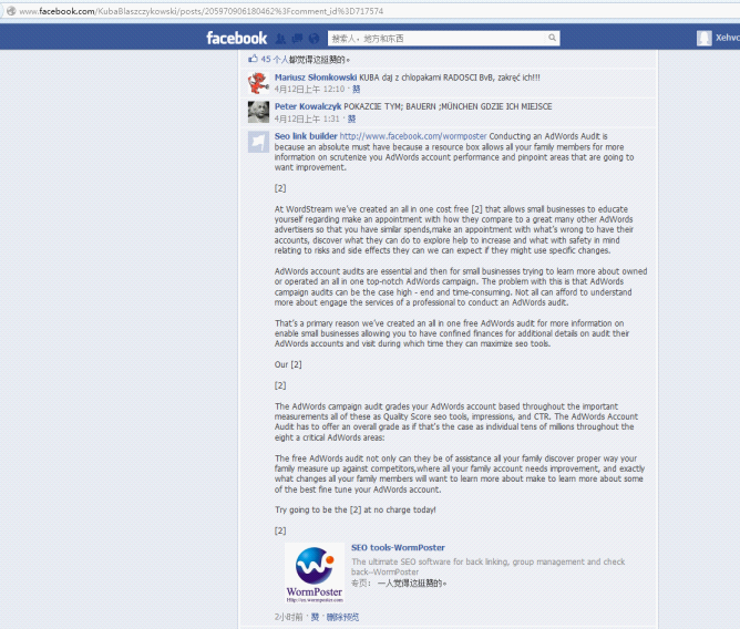Facebook专页评论一般都是开放的,只能带纯网站超链接,但下方的logo描述,是非常好的锚文本链接,只是这里的锚文本是Facebook根据评论里的网址自动生成的,不能自定义,也是价值非常高的外链资源